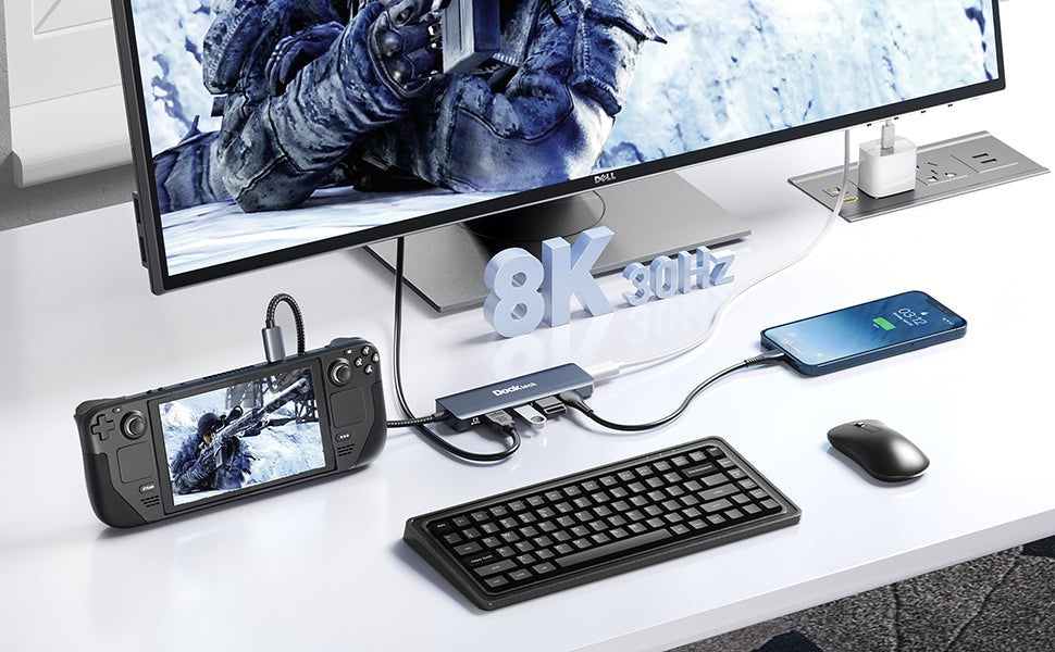 Expand a single USB-C port into a video, peripheral, and charging powerhouse with this Steam Deck Dock with 8K HDMI and Power Delivery. Instantly add 3 USB-A ports and an 8K and 4K 120Hz capable HDMI port to your device. Power and charge your device with max 85W pass-through charging